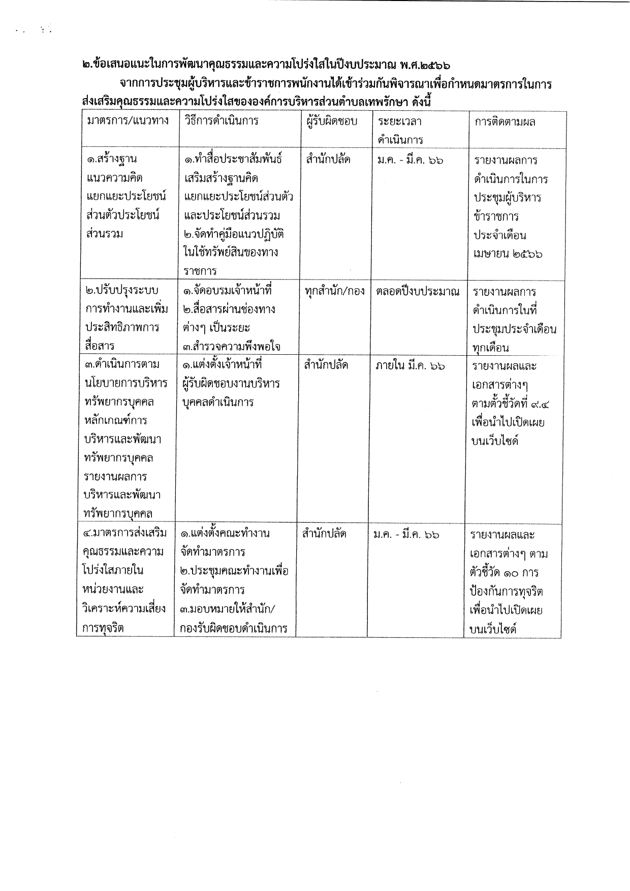 การดำเนินการตามมาตรการส่งเสริมคุณธรรมและความโปร่งใสภายในหน่วยงาน ประจำปีงบประมาณ พ.ศ.2566 [เอกสารเพิ่มเติม]