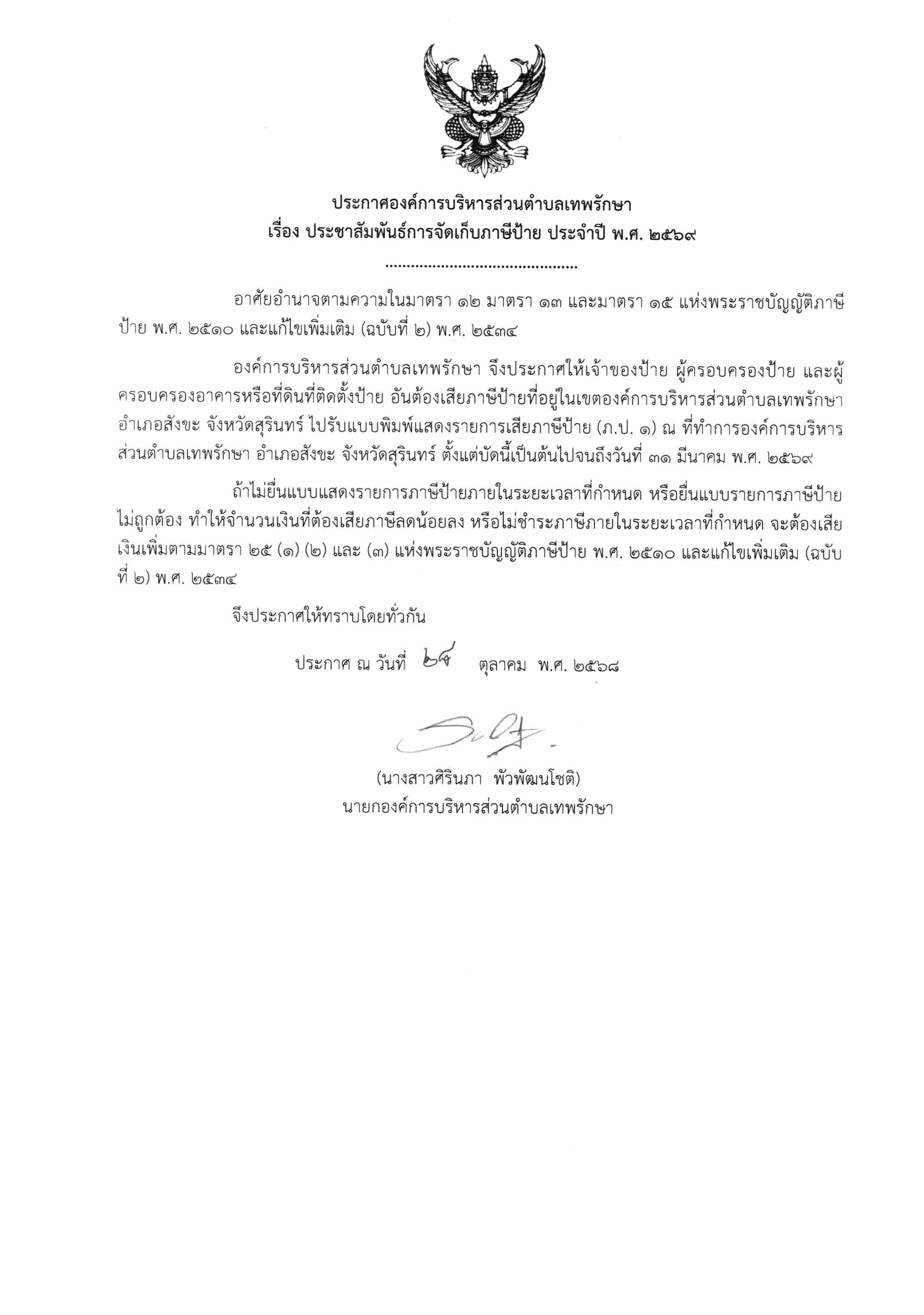 องค์การบริหารส่วนตำบลเทพรักษา จึงประกาศให้เจ้าของป้าย ผู้ครอบครองป้าย และผู้ครอบครองอาคารหรือที่ดินที่ติดตั้งป้าย อันต้องเสียภาษีป้ายที่อยู่ในเขตองค์การบริหารส่วนตำบลเทพรักษา อำเภอสังขะ จังหวัดสุรินทร์ ไปรับแบบพิมพ์แสดงรายการเสียภาษีป้าย (ภ.ป. ๑) ณ ที่ทำการองค์การบริหารส่วนตำบลเทพรักษา อำเภอสังขะ จังหวัดสุรินทร์ ตั้งแต่บัดนี้เป็นต้นไปจนถึงวันที่ ๓๑ มีนาคม พ.ศ. ๒๕๖๙