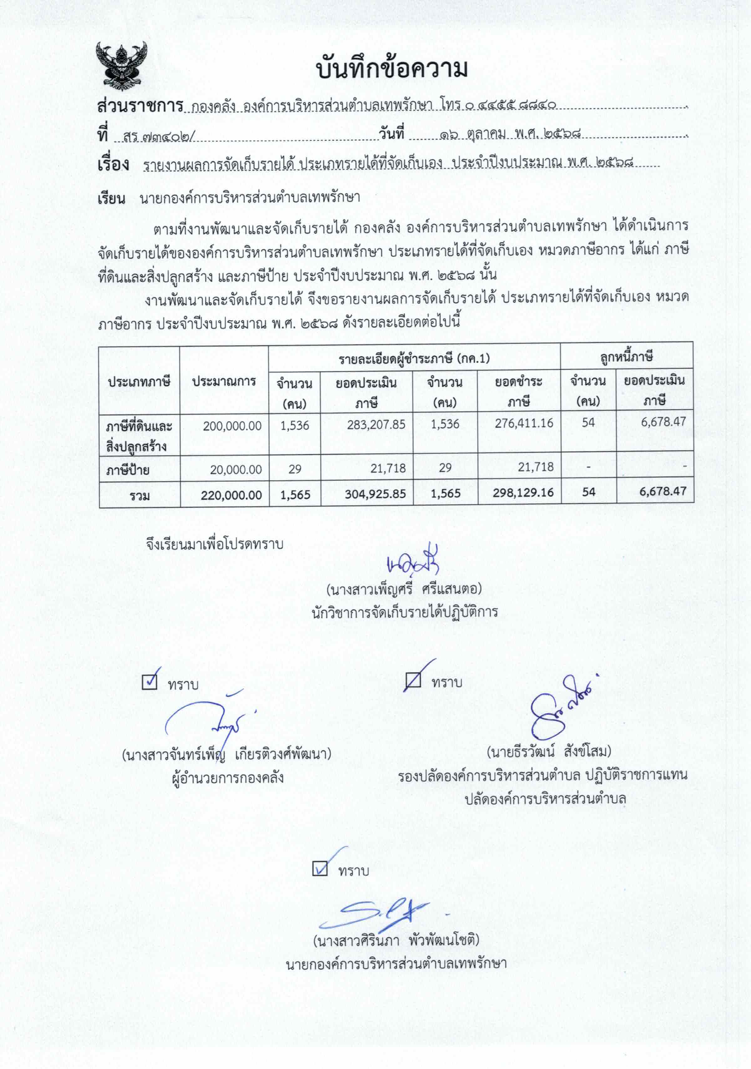 งานพัฒนาและจัดเก็บรายได้ จึงขอรายงานผลการจัดเก็บรายได้ ประเภทรายได้ที่จัดเก็บเอง ประจำปีงบประมาณ พ.ศ. 2568 ดังรายละเอียดที่ปรากฏ