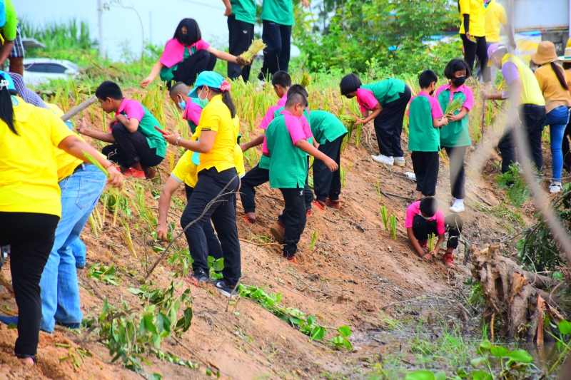 นายธาตรี สิริรุ่งวนิช นายอำเภอสังขะ นำคณะผู้บริหาร สมาชิกสภา ข้าราชการ ทหาร ตำรวจ คณะครูนักเรียนและประชาชนจิตอาสา ปลูกหญ้าแฝกเฉลิมพระเกียรติ